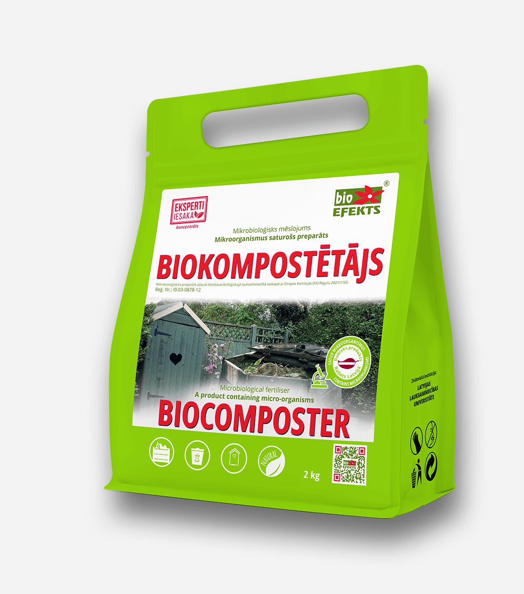 Lietošanas mērķis: dārza un virtuves atkritumu ātra kompostēšana, vienlaikus iznīcinot kompostā patogēnos mikrobus; zāģu skaidu sadalīšana; sausās tualetes satura sadalīšana un smakas novēršana. Iedarbība: BIO KOMPOSTĒTĀJS aktīvi veic organisko vielu noārdīšanu aerobos un anaerobos apstākļos dažādos temperatūras režīmos. Pateicoties lielai mikroorganismu dažādībai preparātā, tas ir efektīvs plašā pH diapazonā: 6,5-8,0. Bioloģisko sadalīšanās procesu sākumā termofīlo mikroorganismu ietekmē masa sakarst līdz 60oC, pastiprināti sāk noārdīties celulozi saturošie savienojumi, iet bojā nezāļu sēklas un slimību dīgļi. Celulozes sadalīšanās produkti tālāk veicina citu mikroorganismu darbību, kas pastiprināti noārda olbaltumvielas un pārvērš organisko slāpekli vienkāršākā, augiem izmantojamā formā. Ja tiek ievēroti kompostēšanas nosacījumi, parasti BIO KOMPOSTĒTĀJA daudzveidīgie mikroorganismi 18oC temperatūrā un augstākā pabeidz savu darbību mēneša laikā. Komposta sākotnēji zaļā krāsa kļuvusi tumši brūna. Tajā iznīcināti augu slimību izraisītāji, nezāļu sēklas. Komposts ir irdens, ar neitrālam tuvu pH, un svaigas zemes smaržu, ko izdala tajā esošās aktinomicētes.