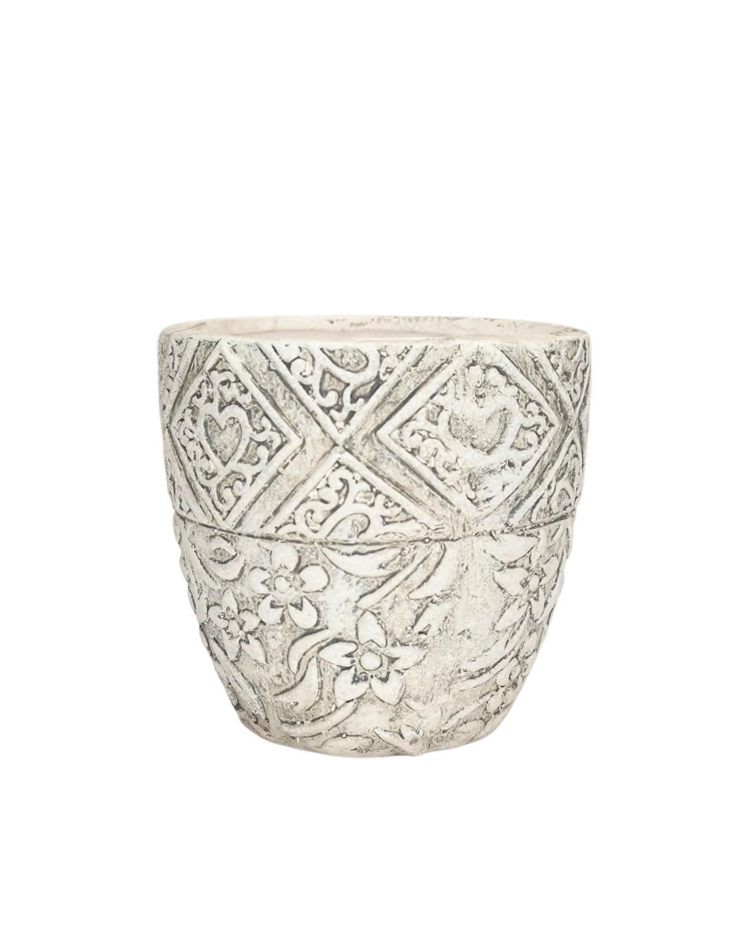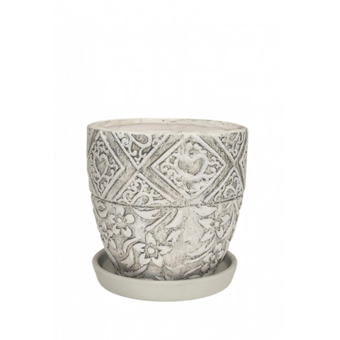 Puķu pods d9xh9cm ar rakstu apmalīte gaiši pelēks ar paliktni