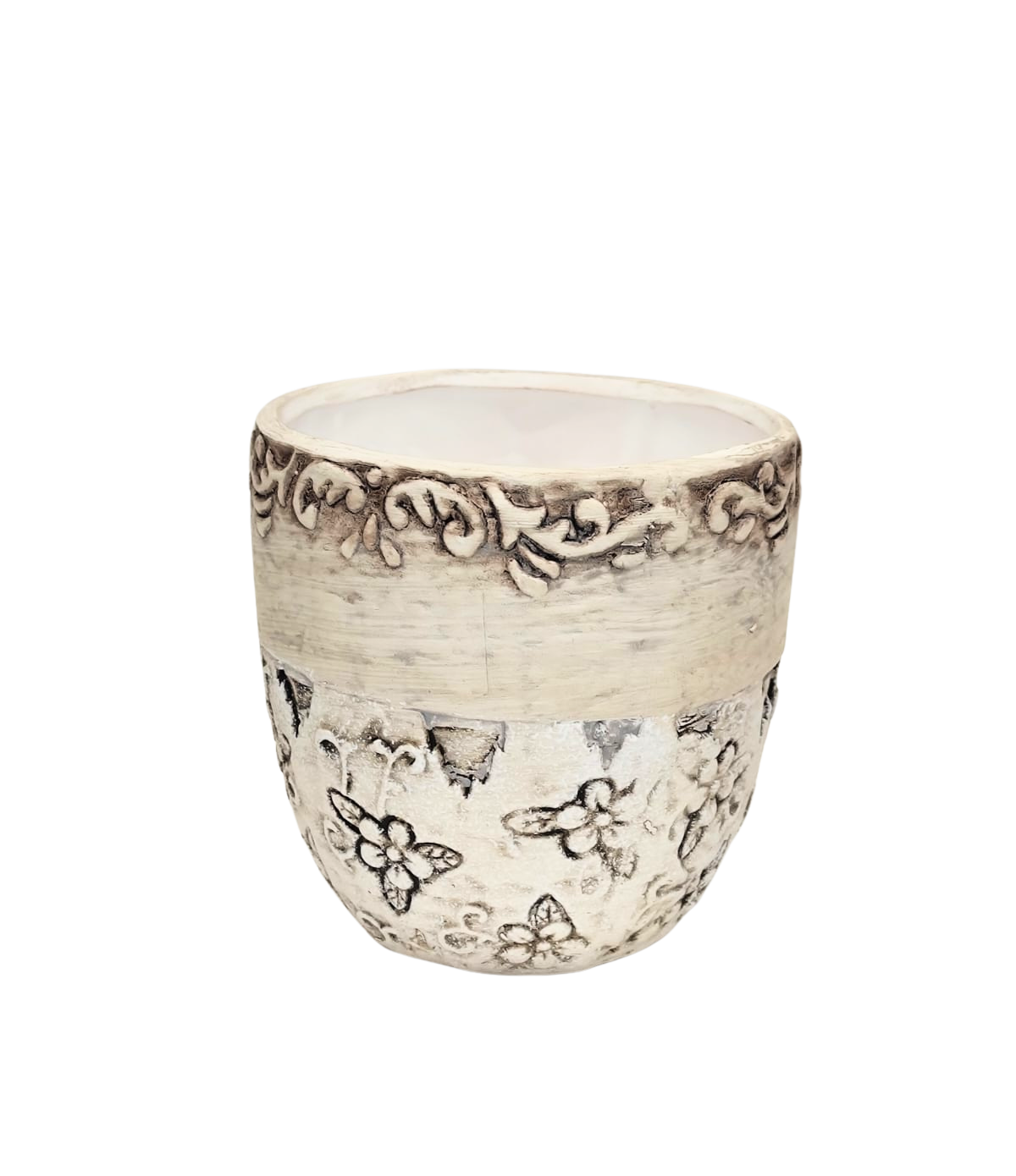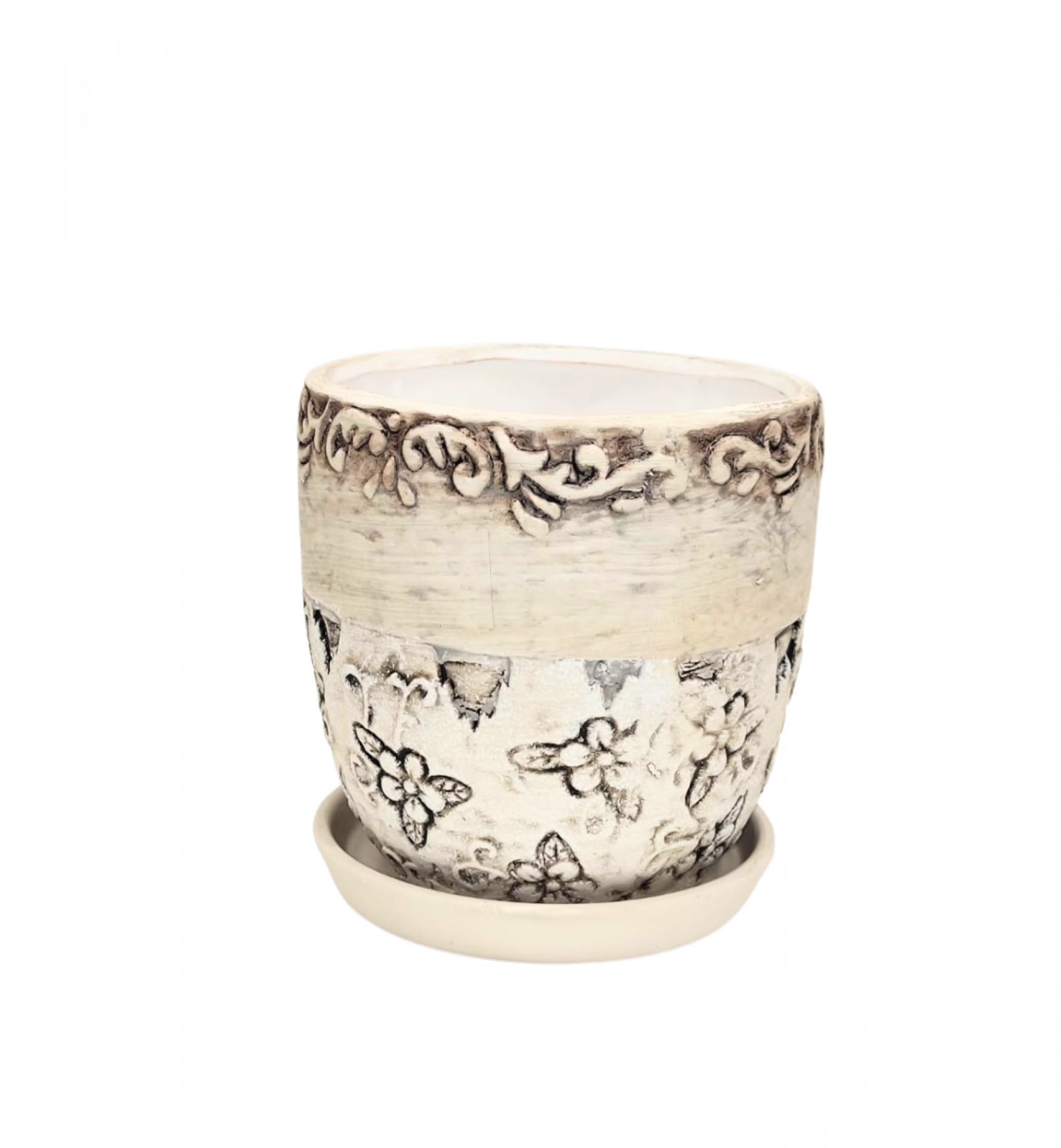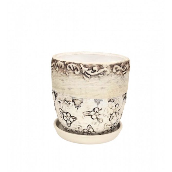 Puķu pods d15xh14cm ar rakstu apmali gaiši pelēks ar paliktni